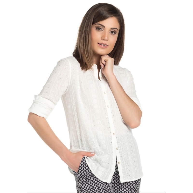 Camisa moça bonita em laise. manga longa e detalhes vazados. fechamento Por botões.