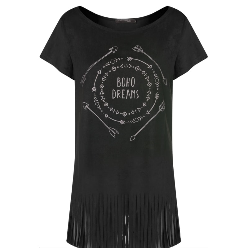 T-SHIRT SUEDE ESTAMPA BOHO DREAMS, MANGAS CURTAS, DECOTE CANOA, BARRA FRANJAS, SHAPE SOLTO. INVISTA NA T-SHIRT COM FRANJAS PARA DEIXAR SEUS LOOKS AINDA MAIS ESTILOSOS!